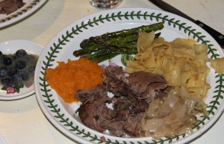 Leg of Lamb, Sweet and Sour Cabbage, Rosemary Noodles, Squash, Asparagus, Strawberries & Blackberries
