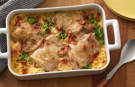 This casserole is super tasty, and really easy to make! Cook pasta, brown some chicken thighs, mix with some broccoli, top with bacon and an easy sauce and bake!