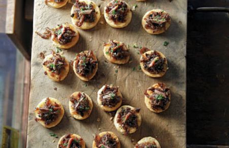 Based on the classic French caramelized-onion tart with olives and anchovies, these little two-bite hors d'oeuvres pack a flavorful punch.