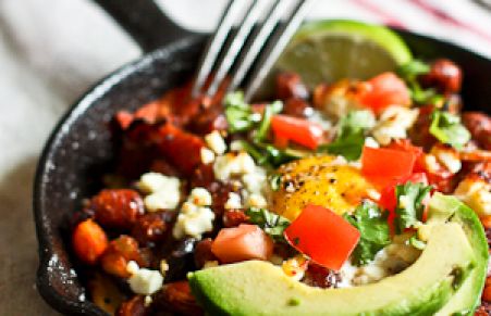 Skillet Huevos is a tortilla layered with your favorite beans with an egg cradled in the beans, topped with cheese and your favorite toppings. Perfect for a weekend breakfast!