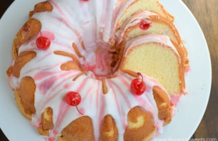 This cherry pound cake is so easy, but you wouldn't know from how beautiful it is! The two-toned glaze makes this simple cake a work of art.