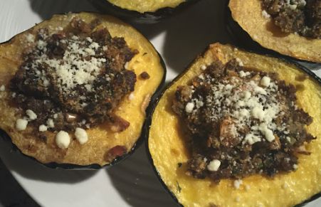 Acorn squash stuffed with pork sausage, mushrooms, eggs, onions and Romano cheese. Dinner is ready in only an hour!