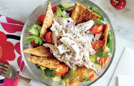 This Greek-style main dish salad features parsley salad topped with homemade chicken salad and pita chips.
