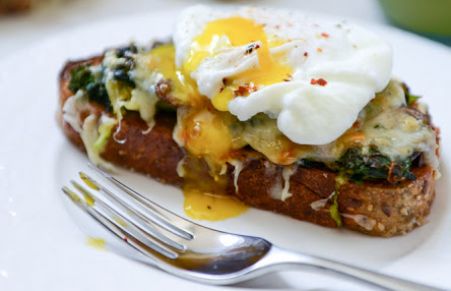 BREAKFAST - Broiled Fontina Toasts with Roasted Garlic and Poached Eggs
