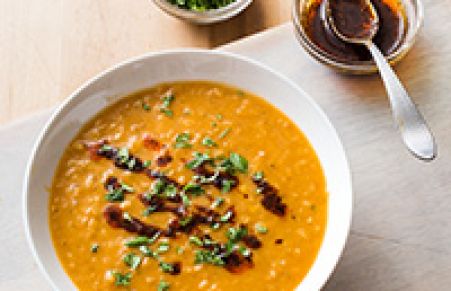 Red lentils cook quickly into a nubbly puree, but their mild flavor requires a bit of embellishment. We start by sautéing onions in butter and use the warm mixture to bloom some fragrant North African spices. Tomato paste and garlic complete the base before the addition of the lentils, and a mix of chicken broth and water gives the soup a full, rounded character. After only 15 minutes of cooking, the lentils are soft enough to be pureed with a whisk. A generous dose of lemon juice brings the flavors into focus, and a drizzle of spice-infused butter and a sprinkle of fresh cilantro complete the transformation of commonplace ingredients into an exotic yet comforting soup.