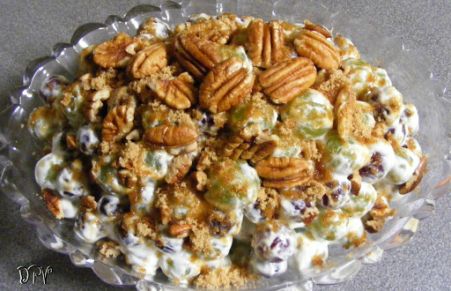 Wish I had known about this fruit salad before now, it is FANTASTIC!! Red and green grapes tossed with a creamy cream cheese dressing and garnished with brown sugar and chopped pecans.