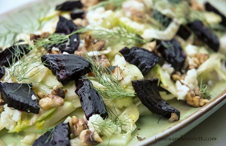 Thinly sliced fennel and granny smith apples offer a contrast of flavors and add a crunch to this amazing salad with roasted beets, toasted walnuts, and crumbled goat cheese.