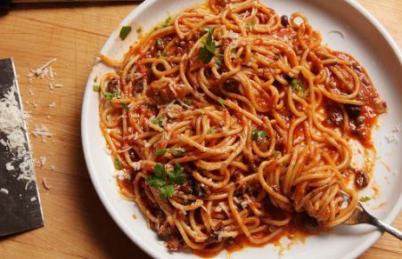 Spaghetti Puttanesca (Spaghetti With Capers, Olives, and Anchovies)
