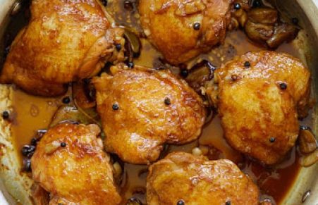 Super easy Filipino styled adobo chicken made using only one pot. Use chicken wings in place of thighs to serve as an appetizer.
