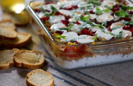 This recipe for Italian seven layer dip features crostini piled with ricotta, sautéed onions, grape tomatoes, garlic, and sausage, pepperoncini, artichokes, roasted peppers and mozzarella.