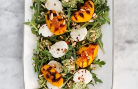 This awesome side dish features sweet grilled peaches, spicy arugula, creamy fresh mozzarella, crunchy pine nuts, and an herby mint pesto. Easy enough to prepare for a weeknights dinner but fancy enough to impress on special occasions.