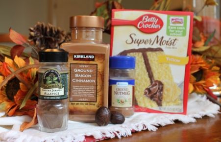 Easily convert your Yellow cake mix into a Spice cake mix by adding some cinnamon, nutmeg, ginger and allspice cloves.
