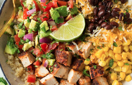 Grilled Chicken and Quinoa Burrito Bowls with Avocado Salsa