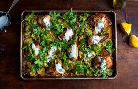 Your typical sheet-pan chicken recipe roasts everything together on a pan at once. This version pairs potatoes with the poultry, and tops everything off with fresh herbs and arugula, making it a true one-pan meal, salad included. A savory yogurt sauce adds a creamy touch, but it’s optional if you’re not a yogurt sauce fan. Feel free to double the recipe if you’re feeding a crowd, though make sure to use two sheet pans so that everything is spread out in one layer, which is critical for browning.