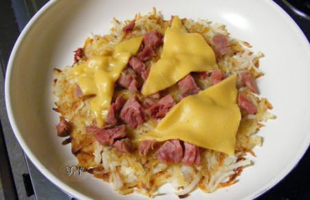 Shredded hash brown potatoes are pan cooked in butter then topped with leftover ham pieces and yellow American cheese.