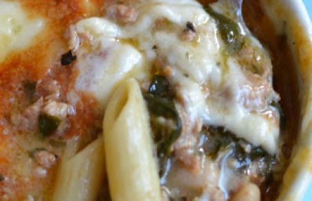 This soup is 'lick the bowl' good! Recipe features Italian sausage, onions, garlic, spinach and penne pasta topped with melted Swiss and Provel cheese. Enough said!