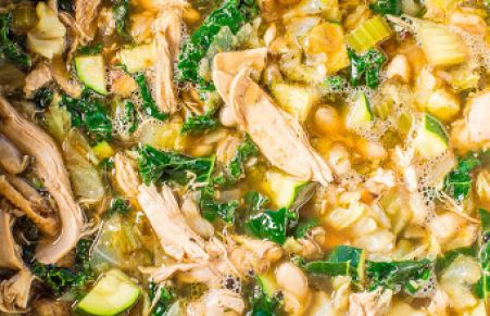 A healthy and hearty chicken soup with kale, beans, onions, cabbage and zucchini. Soup will keep airtight in the fridge for 5 to 7 days or in the freezer for up to 6 months.
