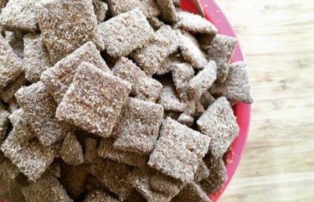 Puppy chow is one of those childhood snacks that we wish we could still eat by the handful as adults, but we know better. Puppy chow, monkey munch, or muddy munch is chocolate and peanut butter coated Chex™ tossed in powdered sugar.