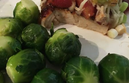 Monterey chicken served with Brussel sprouts, roasted potatoes, corn and fruit salad.