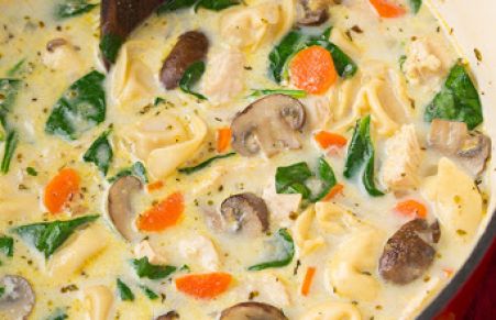 Need to warm up? Try this deliciously creamy and hearty soup with chicken, spinach, mushrooms and tortellini stuffed with cheese. Stay warm and enjoy!