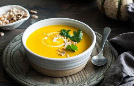 This sweet and slightly spicy pumpkin soup makes a satisfying autumn meal or a delicious appetizer to your holiday spread. Garnish with chopped cilantro, chopped peanuts, and sour cream.