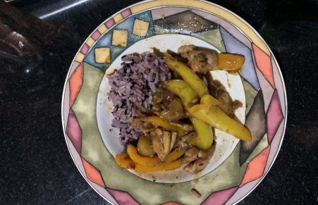 Sweet spicy salty stir fry chicken with Mango and colored bell pepper serve with rice (white or white/wild/black combo)