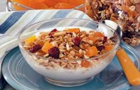 Nutritional Analysis: 1/2 cup granola (calculated without yogurt) equals 212 calories, 4 g fat (trace saturated fat), 0 cholesterol, 88 mg sodium, 41 g carbohydrate, 3 g fiber, 6 g protein. Diabetic Exchanges: 2 starch, 1 fruit.