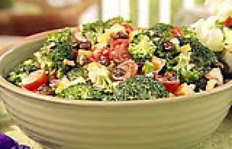 Broccoli salad with crumbled bacon, onions and cheese. For a little sweetness, you can also add raisins.