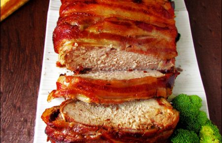 Scrumptious bacon wrapped pork roast with hints of blueberry. Serve with onions and gravy - enjoy!