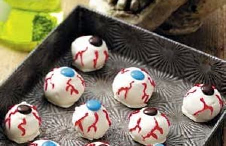 These treats are yummy peanut butter ball candies, dipped into white chocolate with M&M eyes and red gel to make the eyes look scary and bloodshot.