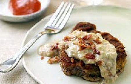 It looks like fried chicken but it's actually steak coated with seasoned flour and bread crumbs. It's pan-fried until crisp, then drizzled with a rich onion gravy.