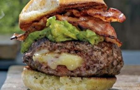 Here, beef burgers are filled with piquant pepper jack cheese, then cooked and topped with guacamole and crispy bacon.