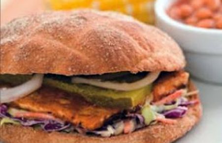 Though vegetarianBBQmay be an oxymoron, once you take a bite of this delicious tofu sandwich topped with coleslaw and dill pickles you won’t mind the contradiction. Serve with: Baked beans and corn on the cob.