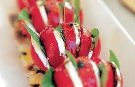 Tomatoes filled with mozzarella slices and basil leaves make for a beautiful presentation and are easy to serve. Balsamic glaze, which is used to season the salad, is found alongside the balsamic vinegars in many stores. If unavailable, use a well-aged balsamic vinegar.
