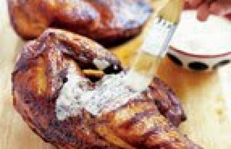Coat the chickens with the sauce twice: once when it is immediately removed from the grill and a second time right before serving. The hot chicken will absorb the sauce like a sponge.