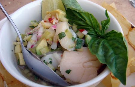 On our date to Sugarbeet restaurant in Longmont, Colorado, I had the most marvelous ceviche. It was made with scallops, avocados, lime juice, red onions, red peppers, jalapeños (I think), and pineapple juice. It was served with a large sprig of basil for a garnish and thinly sliced, homemade potato strips (not chips). Some of the scallop slices were white and some were pink. I don’t know if that meant that some were cooked and some were raw, or if the pink ones were marinaded in something different. Either way it was marvelous!