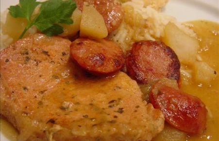Read more: http://southern.food.com/recipe/smothered-pork-chops-and-sausage-113472#ixzz1XXZkGVes