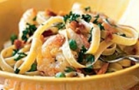 A dish of shrimp sautéed in bacon drippings and tossed with fettuccine sounds like a no-no for the calorie conscious. But at under 400 calories a serving, indulge! Cook the fettuccine al dente so the strands remain intact and maintain their slightly firm texture.
