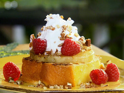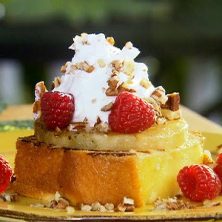 Warm grilled pineapple, tops toasted grilled pound cake served with whipped cream, raspberries and nuts
