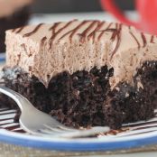 A rich Hot Chocolate Poke Cake with hot fudge and hot chocolate whipped cream