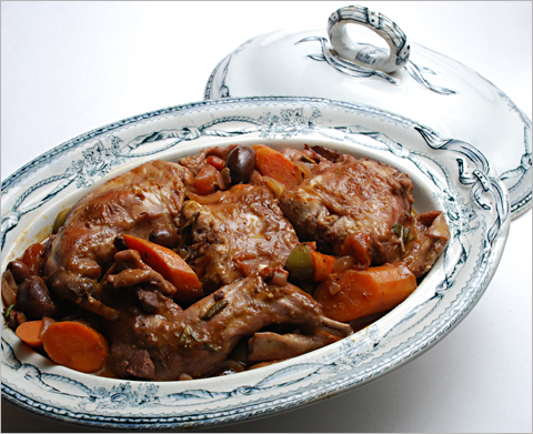 Slow cooked with carrots, onions, tomatoes, olives, fresh herbs, wine and brandy, braised rabbit makes an impressiv...