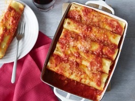 Arrange the prepared cannelloni, seam-side down, in a single layer in the baking dish. Spoon the remaining 2 cups tomato sauce evenly over the cannelloni. Sprinkle the remaining 1/2 cup grated Parmesan over top.