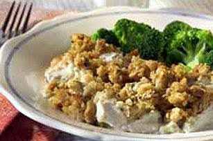 PLACE chicken in 13x9-inch baking dish or 2-qt. casserole. Mix soup and sour cream until well blended; pour over chicken. Top with stuffing.