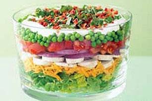 LAYER spinach, 1 cup of the cheese, the mushrooms, onions, tomatoes and peas in 3-qt. serving bowl.