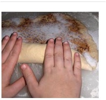 Roll dough out into a basic rectangular shape. Use a butter knife or fingers to spread 2 tbsp softened butter on the top of rectangular dough. Evenly spread about 2 tbsp sugar and 1 tbsp cinnamon on top of butter.