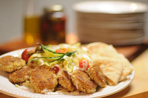 4. Rinse and drain the chickpeas (about 1 1/3 cups). Pulse them in the food processor just until they are coarsely chopped; remove 1/2 chopped chickpeas and add it to the onion mixture. Add the egg, tahini, and salt to the chickpeas remaining in the processor and process them until they are very finely ground; stir them into the onion mixture. Cover the mixture and chill it for 10 minutes. Meanwhile, prepare the Creamy Garlic Dressing.