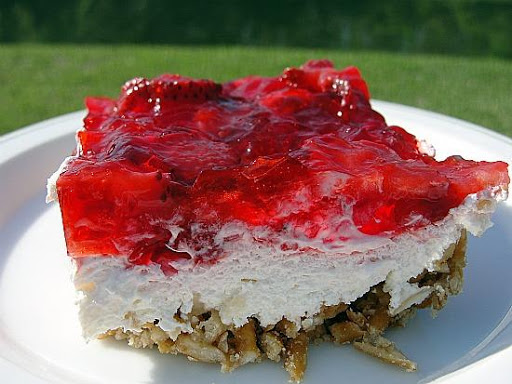 1Preheat oven to 350 degrees.2Place pretzels in ziplock bag and crush into small pieces using rolling pin. Measure pretzels after crushing.3Mix together pretzels, 3 tbsp sugar, and butter.4Pat pretzel mixture into a 9 x 11 pan and bake for 10 minutes.5When the crust is cool, mix cream cheese, 3/4 cup sugar and Cool Whip together and spread on crust.6Bring 2 cups water to a boil and stir in strawberry Jello. Add cold water and mix well.7Add strawberries.8Let mixture set until slightly thickened, then pour over cream cheese mixture.9Refrigerate until jello is firm.