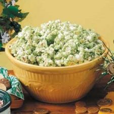 To assemble: Using a sharp serrated knife, cut 3 cupcakes in half vertically, gently sawing through the paper liners; set aside. Frost the remaining cupcakes. Put the sanding sugar on a small plate and roll the edge of each cupcake 3/4 of the way around in the sugar, making a green border around each with a gap on one side. On a large serving platter, arrange 18 cupcakes in groups of three, pushing them together at the gaps, to make 6 shamrock cakes. Dip the tops of the cupcake halves in sugar and wedge a pointy end of 1 half between 2 of the cupcakes in each group to form the stems.