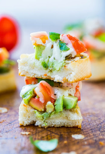 Avocado, Tomato, and Mozzarella Crostini (vegetarian)