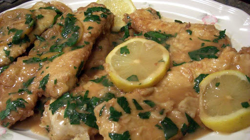 Toss the lemon slices into the pan and cook for 1 to 2 minutes. Until fragrant. Add the wine, broth, and lemon juice, and simmer for 5 minutes to reduce the sauce slightly. Roll the butter in some flour and add to the skillet, this will thicken the sauce. Stir to incorporate and dissolve the flour. Reduce the heat to medium-low and returnt he chicken to the pan; place the lemon slices on top of the cutlets. Simmer gently for 2 minutes to heat the chicken through. Season with salt and pepper and garnish with chopped parsley before serving.